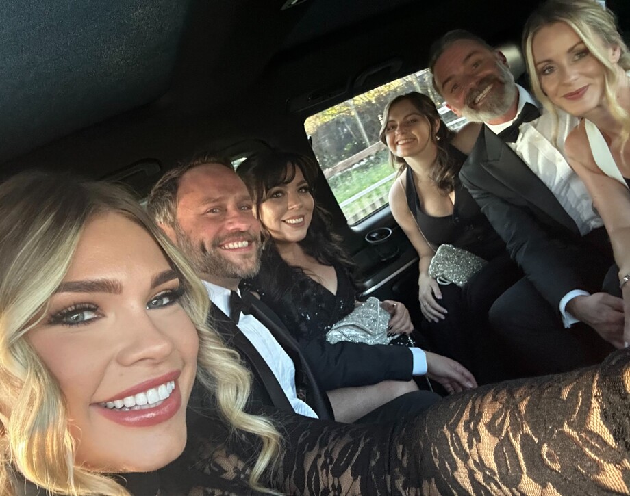 Top image shows Caitlin Connolly pictured with Coronation Street actors Peter Ash and Daniel Brocklebank with others en route to the NTAs.